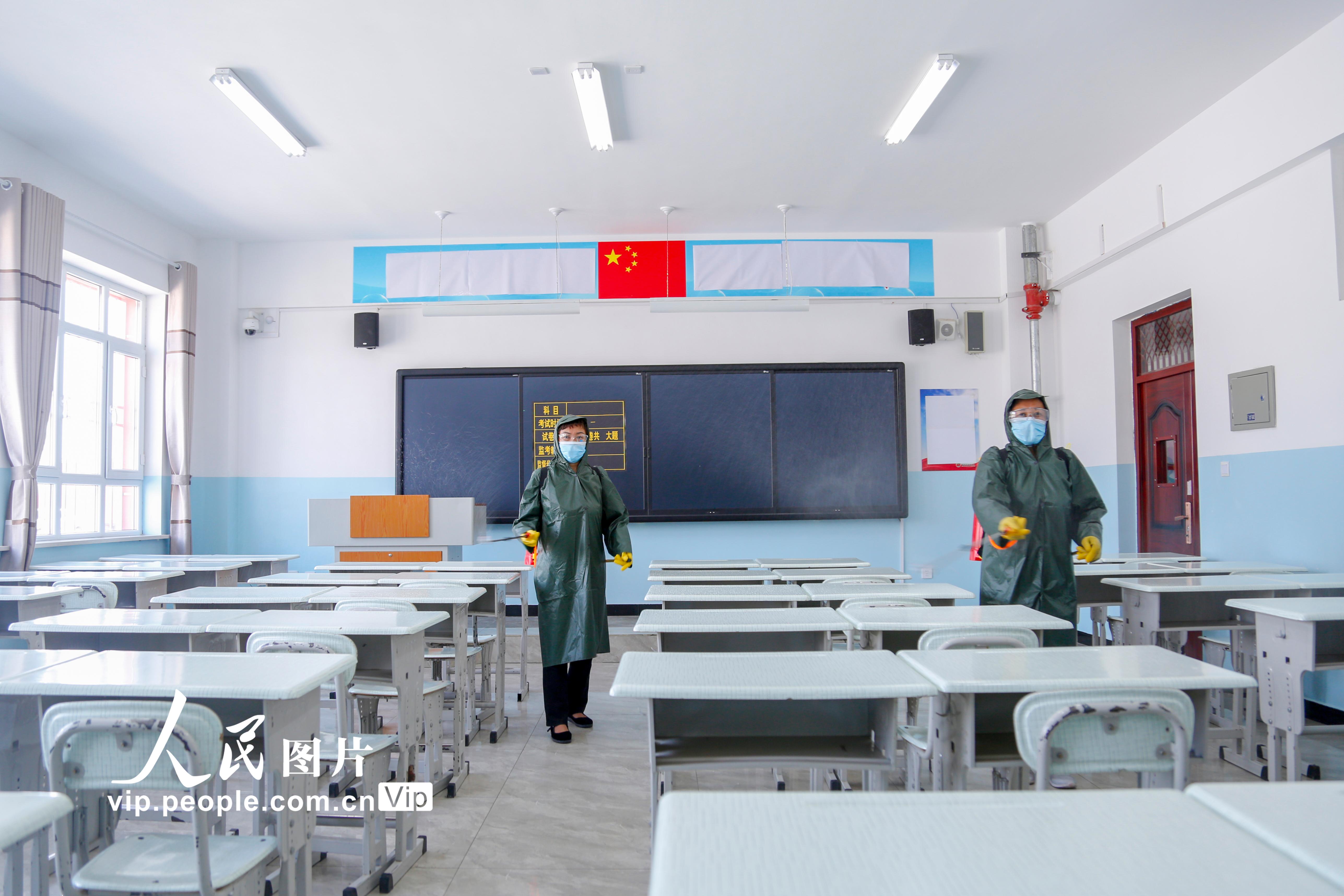 高考臨近,在新疆精河縣高級中學各考點工作人員在給每個考場進行消毒,以迎接高考的到來。賽小黑/人民圖片