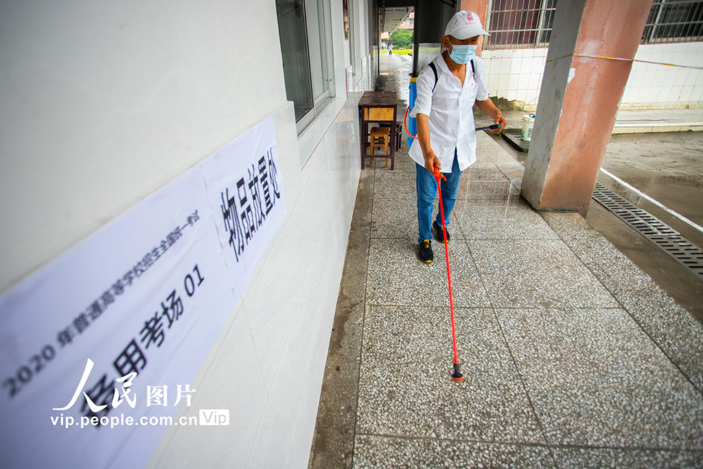 2020年7月5日,江西省九江市湖口縣第二中學校園內疾控防疫人員正在對高考考場進行全面消毒殺菌。高考大幕即將開啟,今年湖口縣將有2000余名考生走上高考考場,共設有2個考點,各設置4個隔離備用考場,根據防疫要求,進一步完善和優化方案和措施,確保高考安全、有序、平穩進行。張玉/人民圖片