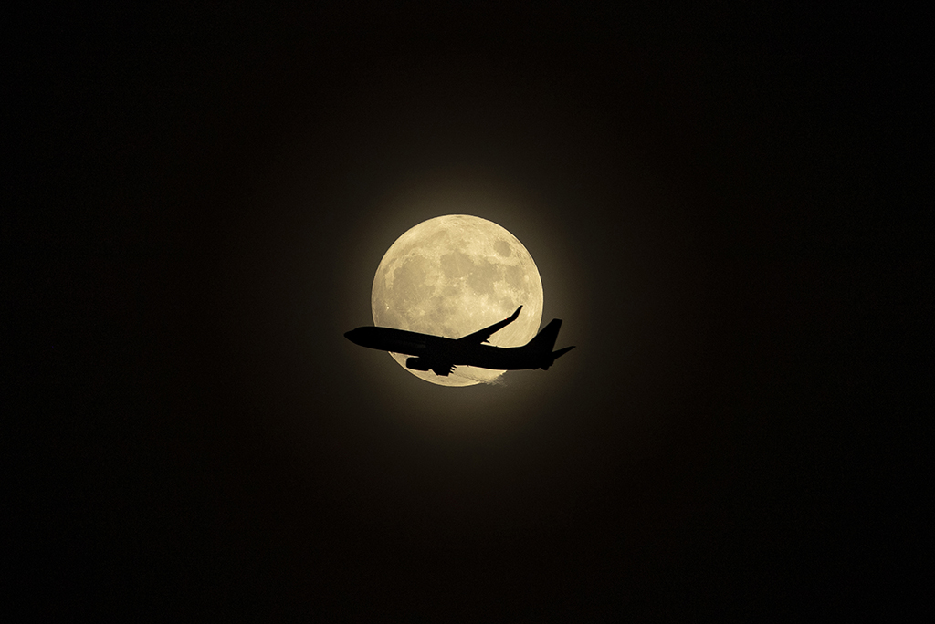 2020年8月3日晚,重慶市渝中區,一輪明月高懸夜空,一架飛機“穿月”而過。何超/攝