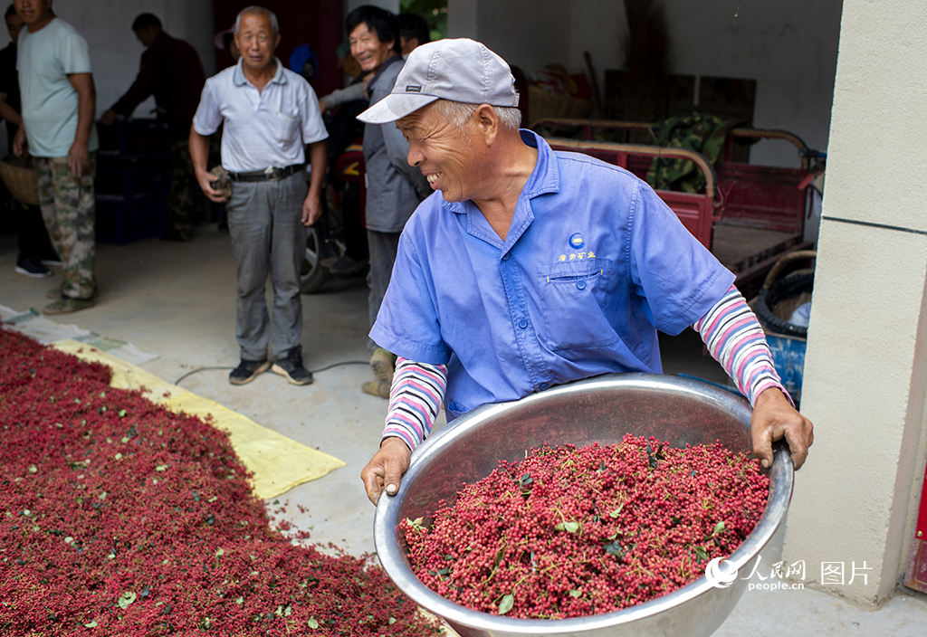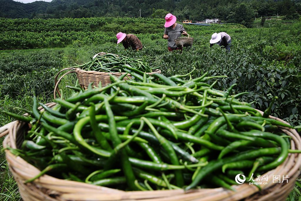 2020年7月16日,陜西省渭南市潼關縣城關街道辦留翎村的農民趁著雨過天晴,抓緊搶收早熟花椒鳳椒。近年來,潼關縣結合塬大、溝坡地多的實際,大力發展花椒產業,鼓勵群眾種植大紅袍、獅子頭、鳳椒等品種花椒,全縣花椒種植面積達13萬畝,成為群眾脫貧致富的主導產業之一。張樹忠/人民圖片