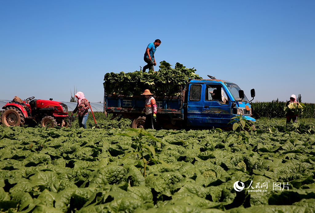 2020年7月27日,在甘肅省張掖市甘州區黨寨鎮二十里堡村,村民正在乘雨后天晴,搶收二茬娃娃菜,好菜走地空及時耕種三茬菜,田間地頭一派繁忙景象。楊永偉/人民圖片