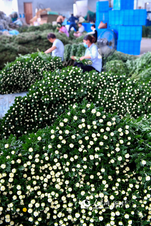 連日來,浙江省東陽市歌山鎮尚侃村菊花基地里,花農們為減少今年梅汛期久且雨水多,對菊花生長造成的損失,起早摸黑搶收今年的第一批菊花,整理、捆扎好后交給公司統一發貨出口國外。包康軒/人民圖片