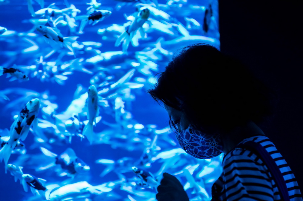 8月27日,在日本東京舉辦的一場藝術水族展的媒體預展上,一名女子欣賞水族箱里的金魚。新華社/法新