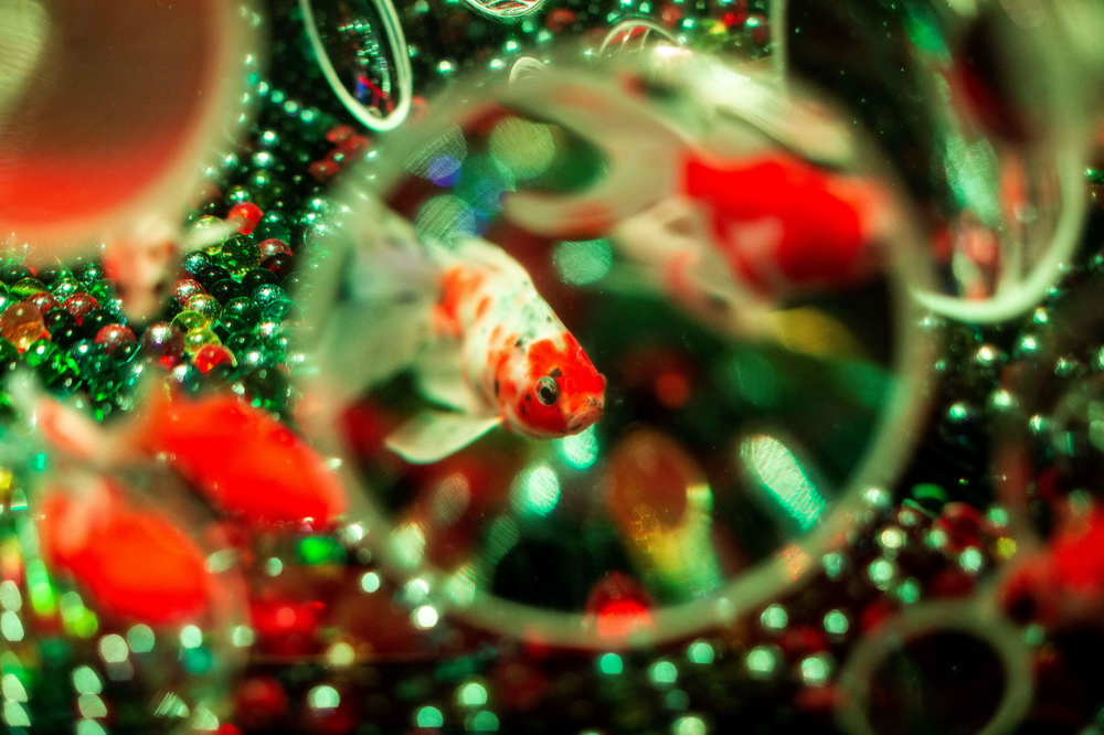 8月27日,在日本東京舉辦的一場藝術水族展的媒體預展上,金魚在被彩燈照亮的水族箱中游弋。新華社/法新