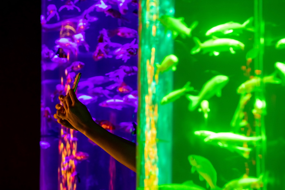 8月27日,在日本東京舉辦的一場藝術水族展的媒體預展上,一名女子用手機拍攝水族箱里的金魚。 新華社/法新