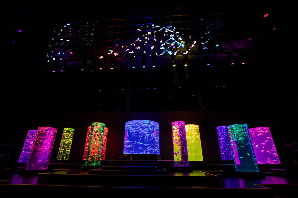 8月27日,在日本東京舉辦的一場藝術水族展的媒體預展上,金魚在被彩燈照亮的水族箱中游弋。新華社/法新