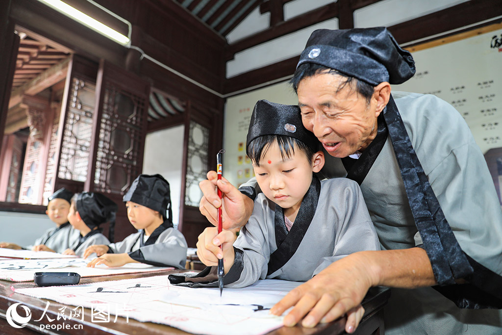 2020年9月1日,浙江省湖州市南潯區和孚鎮泉生小學開展“尚儒明理”開學第一課活動,身穿漢服的小學新生走進入學門,通過正衣冠、拜師行禮、朱砂啟智、擊鼓明志、啟蒙描紅等儀式,體驗傳統古代學生入學的第一課,樹立求知明禮、尊師重道意識。傅李佳/攝