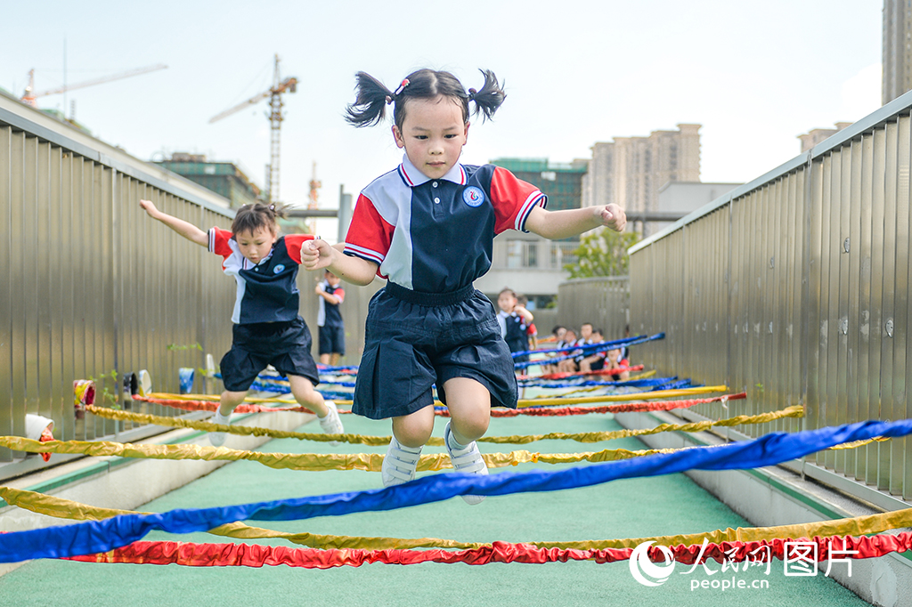 2020年9月1日,浙江省湖州市長興縣龍山街道中心幼兒園開展“樂享運動,健康生活”主題的“開學第一課”活動,孩子們通過穿越火線、滾風火輪、跳牛皮筋、擲流星球等特色體育運動,享受運動帶來的快樂,強健體魄,倡導健康生活。吳拯/攝