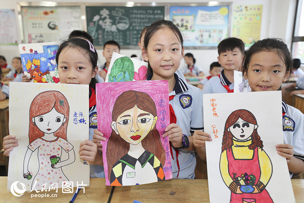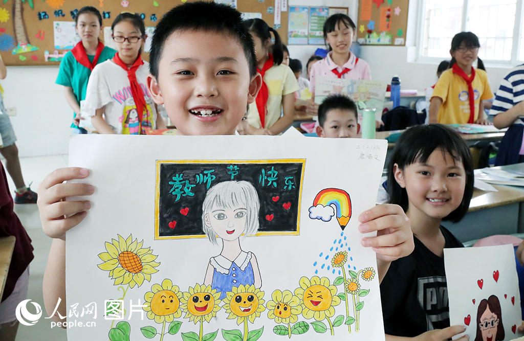 在三十六個教師節來臨之際,江蘇省蘇州市平直實驗小學校的學生們紛紛用彩筆畫出了心目中最美老師形像,并將畫作送給老師。華雪根/攝