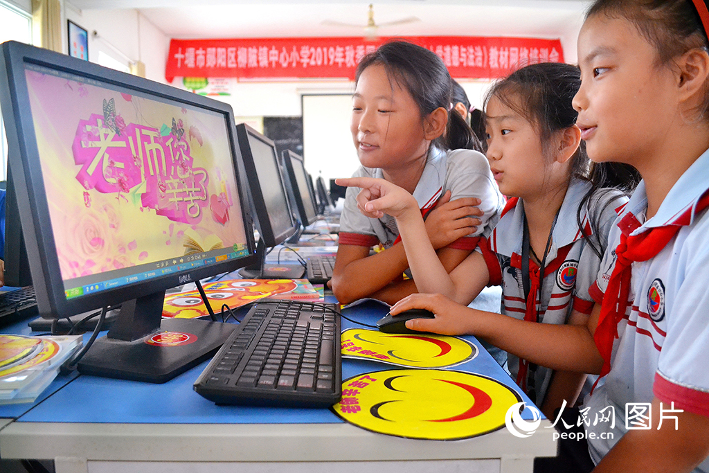 在三十六個教師節來臨之際,湖北省十堰市鄖陽區柳陂鎮中心小學學生利用信息課時間制作了一張張精美漂亮的電子賀卡,作為教師節禮物,通過微信、QQ等既節儉又環保的方式,向他們的老師表達節日的祝福與感恩之情。楊顯有/攝