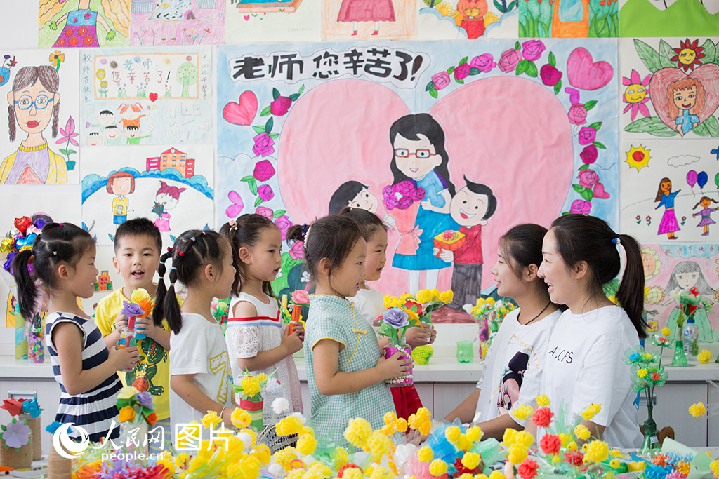 2020年9月8日,江蘇省如皋市外國語幼兒園開展“感念師恩”迎接教師節活動。小朋友用雪碧瓶、廢舊彩紙,麻繩、彩色垃圾袋、吸管 等廢舊物品制作“鮮花”,為老師獻花送祝福,表達對老師的感激之情。徐慧/攝