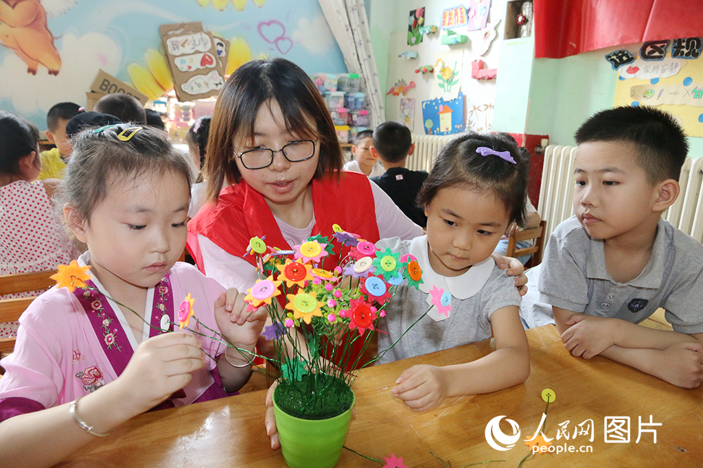 2020年9月8日,安徽省合肥市明光路街道團工委環保志愿者走進轄區御景灣幼兒園,指導小朋友利用廢舊物品制作手工花束送給老師,表達對恩師的感激之情和節日祝福。熊偉/攝