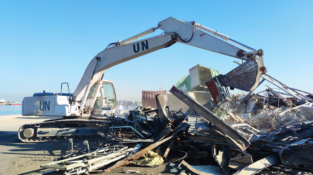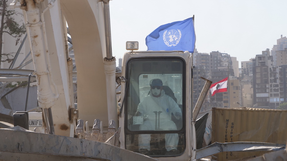 10月1日,中國維和官兵在黎巴嫩貝魯特港用挖掘機清理爆炸廢墟。 新華社發(趙文環攝)