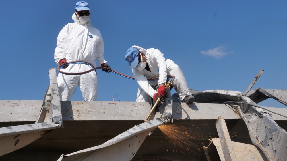 10月1日,中國維和官兵在黎巴嫩貝魯特港清理爆炸廢墟,切割倒塌建筑物鋼架。 新華社發(趙文環攝)