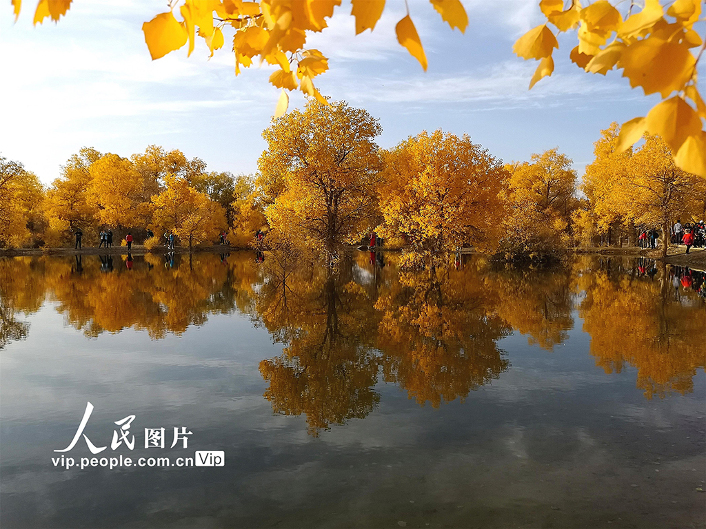 2020年10月10日,天氣晴朗,甘肅省酒泉市金塔沙漠胡楊林景區的胡楊林在陽光照耀下金黃燦爛,與湖水相映美如圖畫,令人流連忘返。該景區位于甘肅省酒泉市金塔縣城以西的潮湖林場,胡楊林分布密集,長勢良好,為三北防護林體系的一部分。吳學珍/攝
