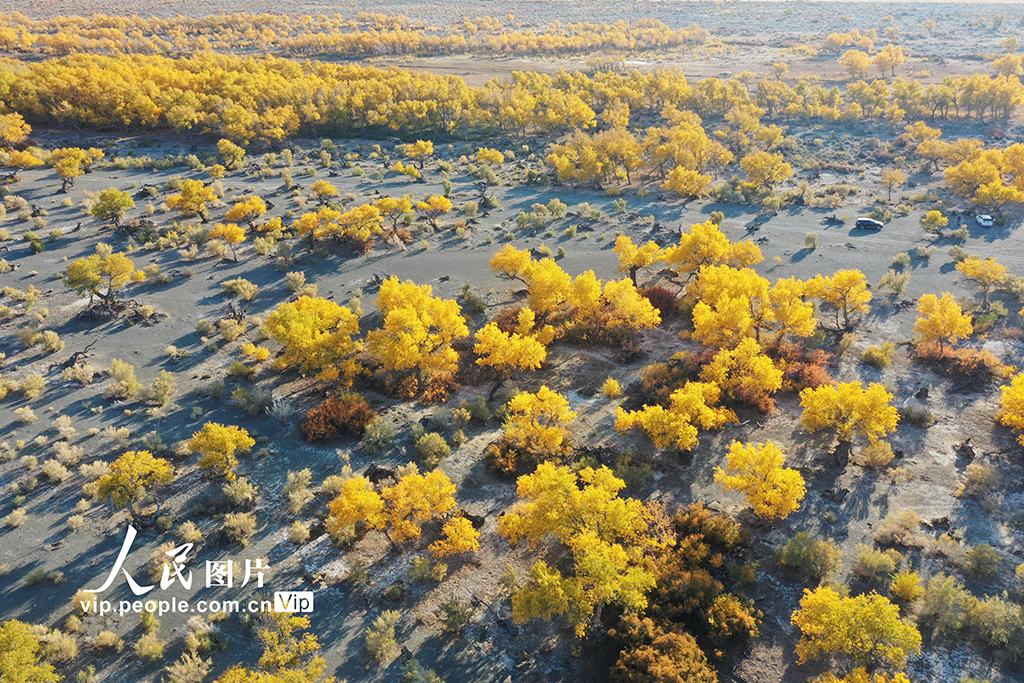 艾比湖地處新疆博州境內,是新疆最大的咸水湖,是準噶爾盆地最大的湖泊。在艾比湖北岸科克巴斯陶片區生長著數萬畝胡楊。每到深秋,胡楊的樹葉開始由綠變黃,最后成金黃色,將艾比湖北岸裝扮得格外美麗,成為一道亮麗的風景線。胡維斌/攝
