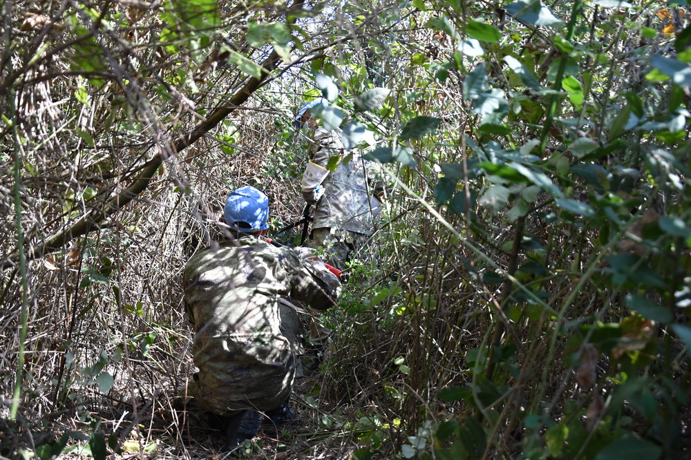 10月23日,在黎巴嫩南部與以色列邊境“藍線”附近,中國掃雷官兵穿行在草叢間。新華社發(丁文棟攝)