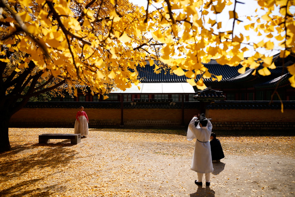 11月5日,在韓國首爾,一對夫婦在銀杏葉下拍照。新華社/路透