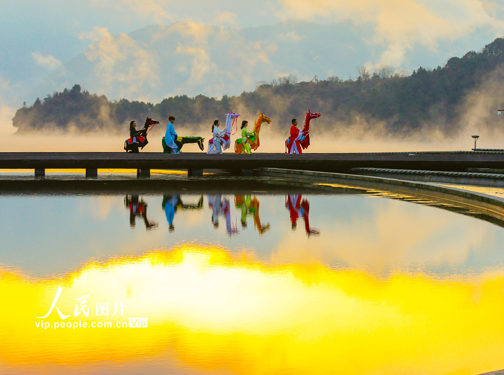 2021年1月1日,浙江淳安珍珠廣場上溢著喜氣洋洋的氣氛,淳安縣睦劇團表演國家級非物質文化遺產“淳安竹馬”迎接新年到來,祝福祖國新年更加美好。王建才攝(人民圖片網)