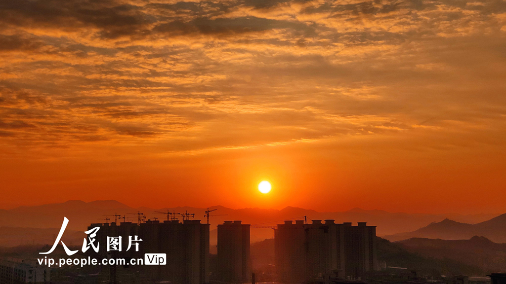 2021年1月1日,廣西賀州天氣晴朗,日出壯觀,初升的朝陽映襯城市建筑,構成一幅美麗的新年旭日東升畫圖。廖祖平攝(人民圖片網)