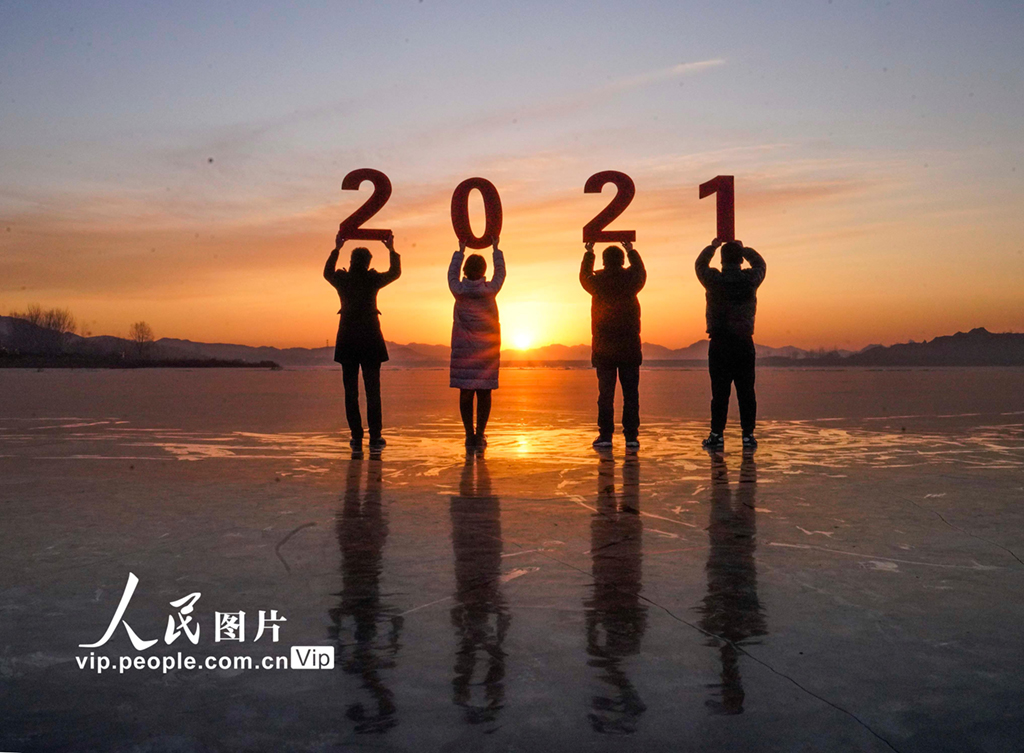 2021年1月1日清晨,河北遵化市民紛紛走出家門來到侯家寨結冰的般若湖上,迎接新一年的第一縷曙光。劉滿倉攝(人民圖片網)