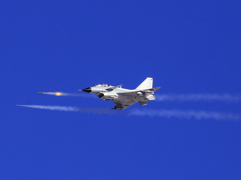 1月4日,中部戰區空軍航空兵某旅組織實彈打靶訓練。這是戰機在發射火箭彈。新華社發(靳慧東 攝)