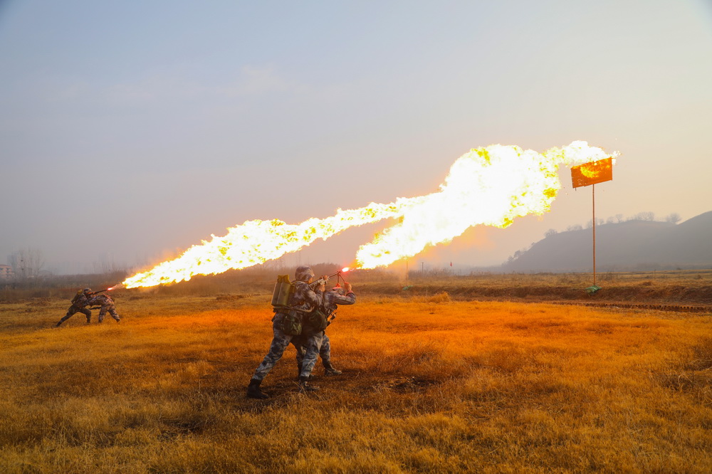 1月4日,駐鄂空降兵某旅組織防化兵開展噴火訓練。新華社發(楊灝峰 攝)