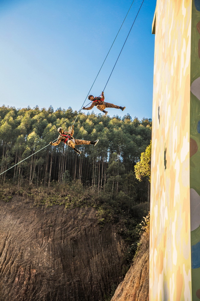 1月4日,武警廣西總隊來賓支隊特戰隊員進行攀登側身下滑訓練。新華社發(果志遠 攝)