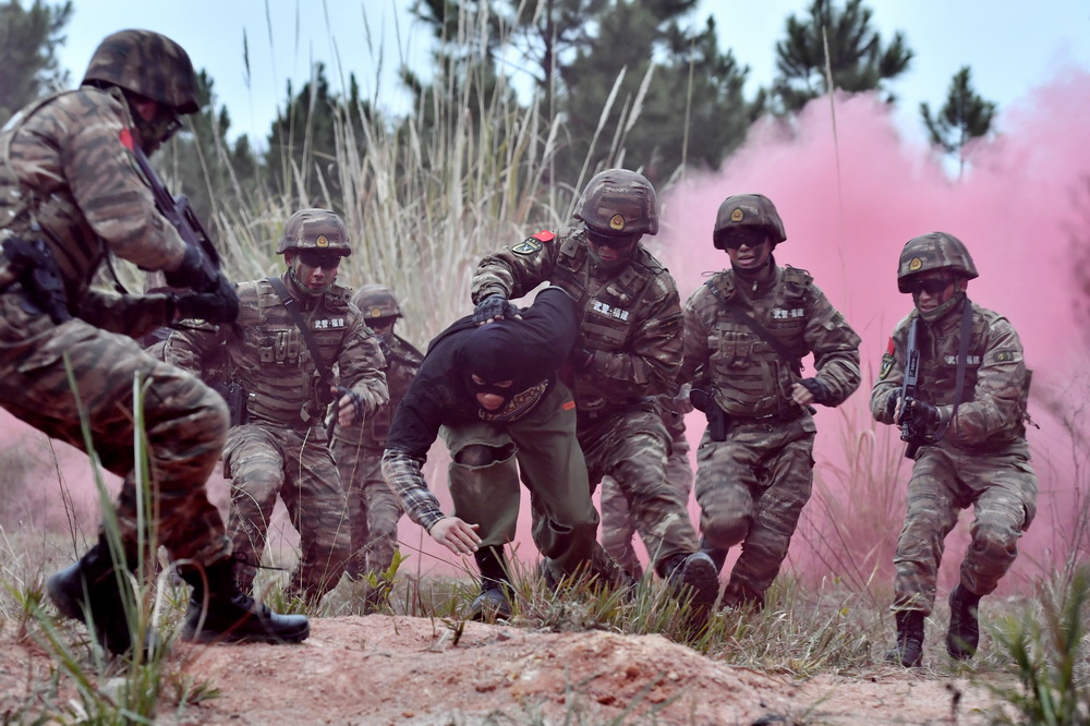 1月5日,武警福建總隊特戰隊員在山林地捕殲戰斗訓練中抓捕“暴恐分子”。新華社發(李濤 攝)