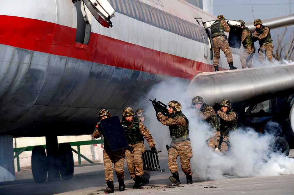 1月4日,武警山西總隊機動支隊特戰隊員開展反劫機演練。新華社發(孫玉山 攝)