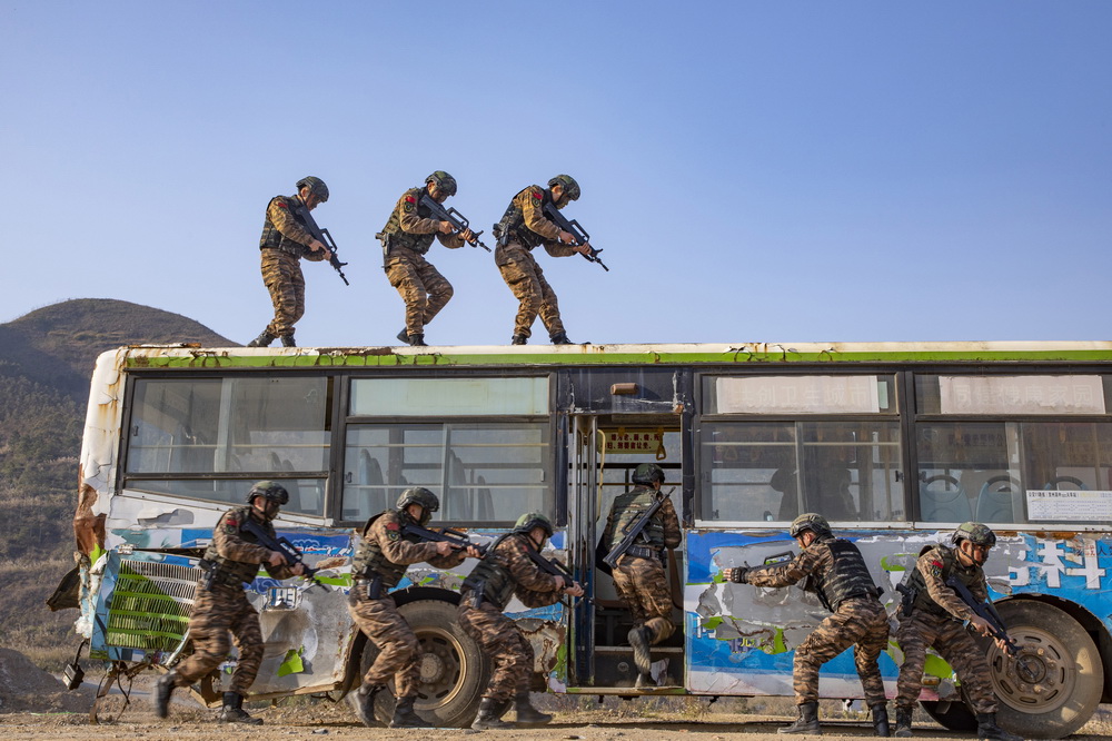 1月4日,武警廣西總隊賀州支隊特戰隊員組織交通工具反劫持演練。新華社發(余海洋 攝)