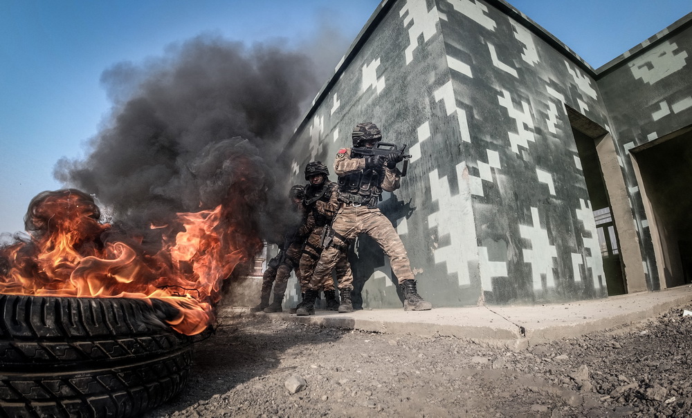 1月4日,武警新疆總隊吐魯番支隊組織特戰隊員開展房屋反劫持訓練。新華社發(王小杰 攝)