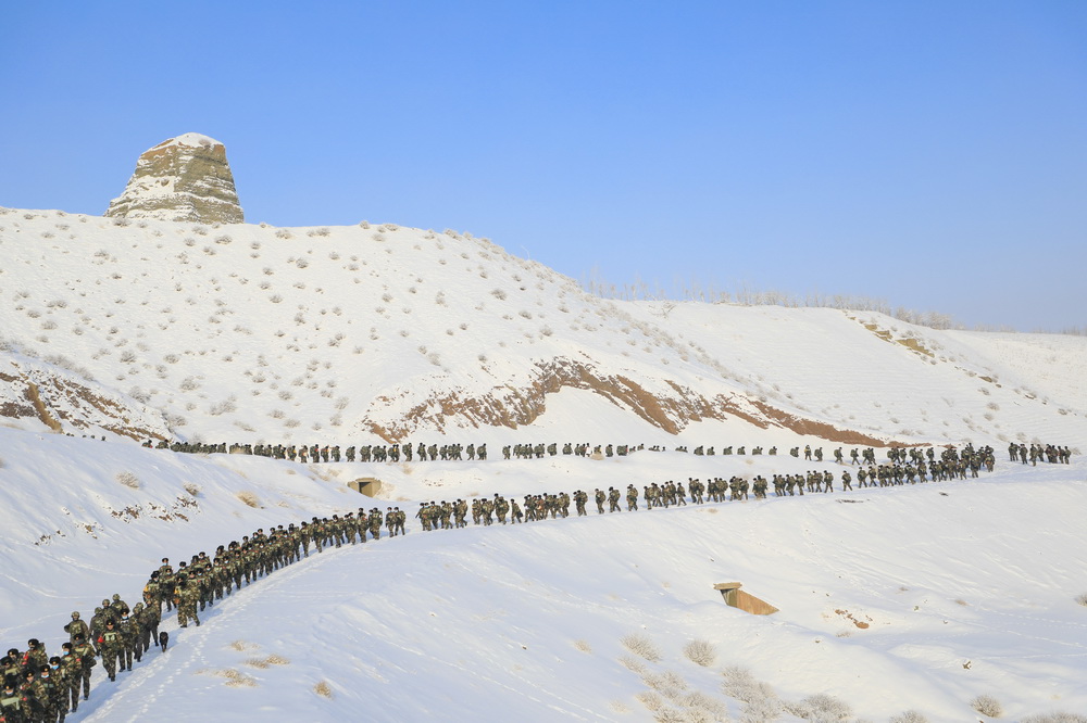 1月4日,武警新疆總隊某機動支隊拉練官兵穿越雪域進行長途行軍。新華社發(張文 攝)