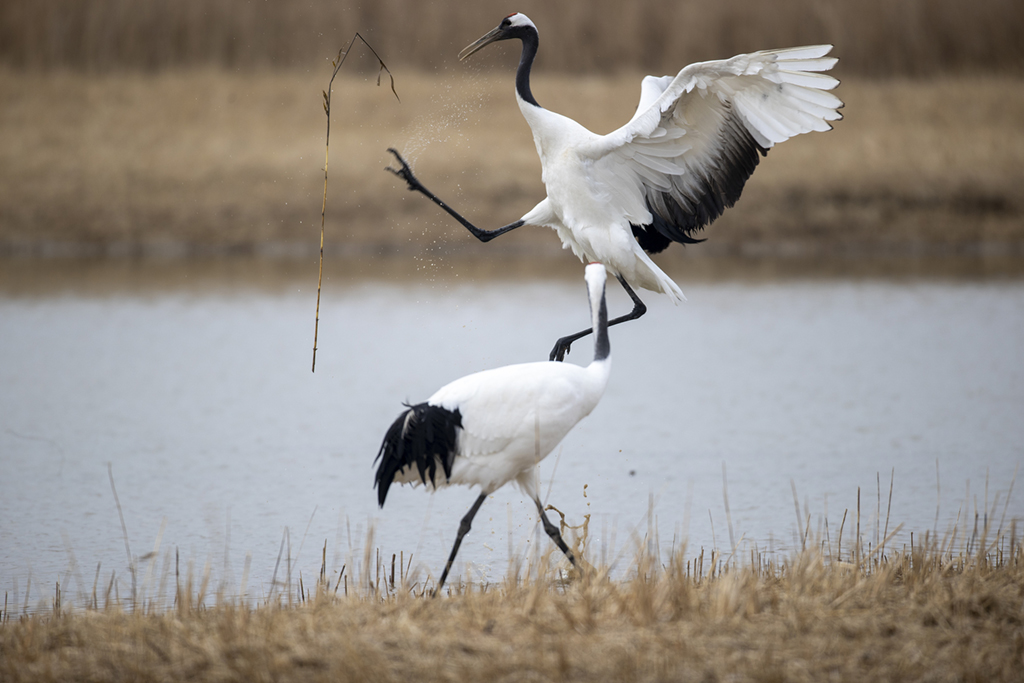 2021年1月31日,越冬的丹頂鶴在江蘇鹽城濕地珍禽國家級自然保護區棲息,它們自由翱翔,生機勃勃,充滿活力,成為保護區冬天里一道獨特景觀。張凱峰攝(視覺中國)