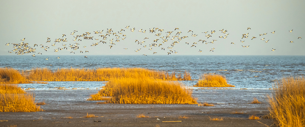 2021年1月29日,山東青島膠州灣濕地公園內的一群越冬候鳥飛過濕地。(視覺中國)