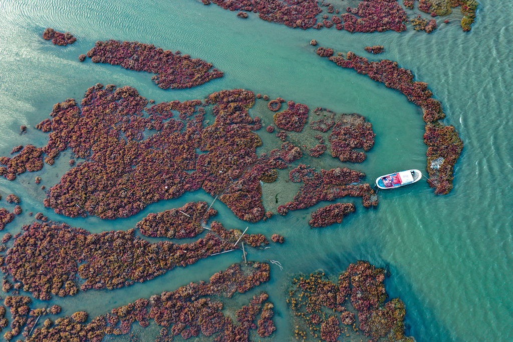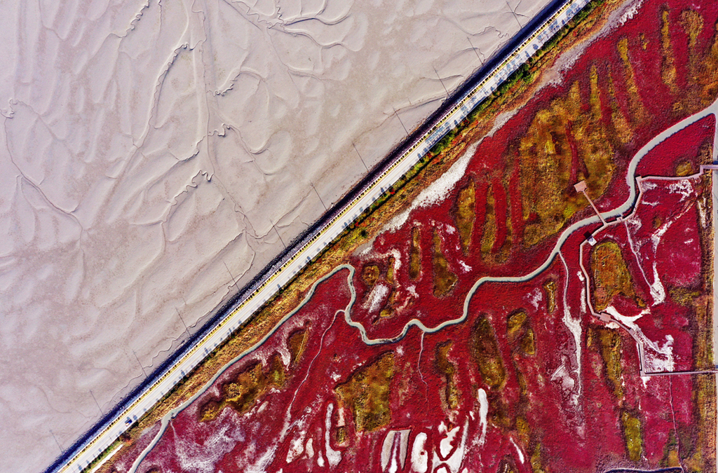 當地時間2020年10月27日,韓國全羅南道太平鹽田灘涂濕地,綠色的七面草和咸草在秋季變紅,紅綠兩色在鹽田上構成油彩畫。(視覺中國)