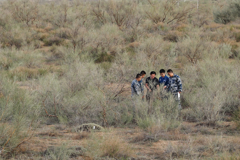 空軍某運輸搜救團一大隊官兵和地方林業人員在內蒙古阿拉善左旗“1992年播區”察看植物生長情況(2020年6月8日攝)。新華社發(劉暢 攝)