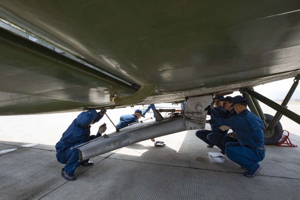 空軍某運輸搜救團機務人員安裝自主研制的飛播器(2020年4月18日攝)。新華社發(劉暢 攝)