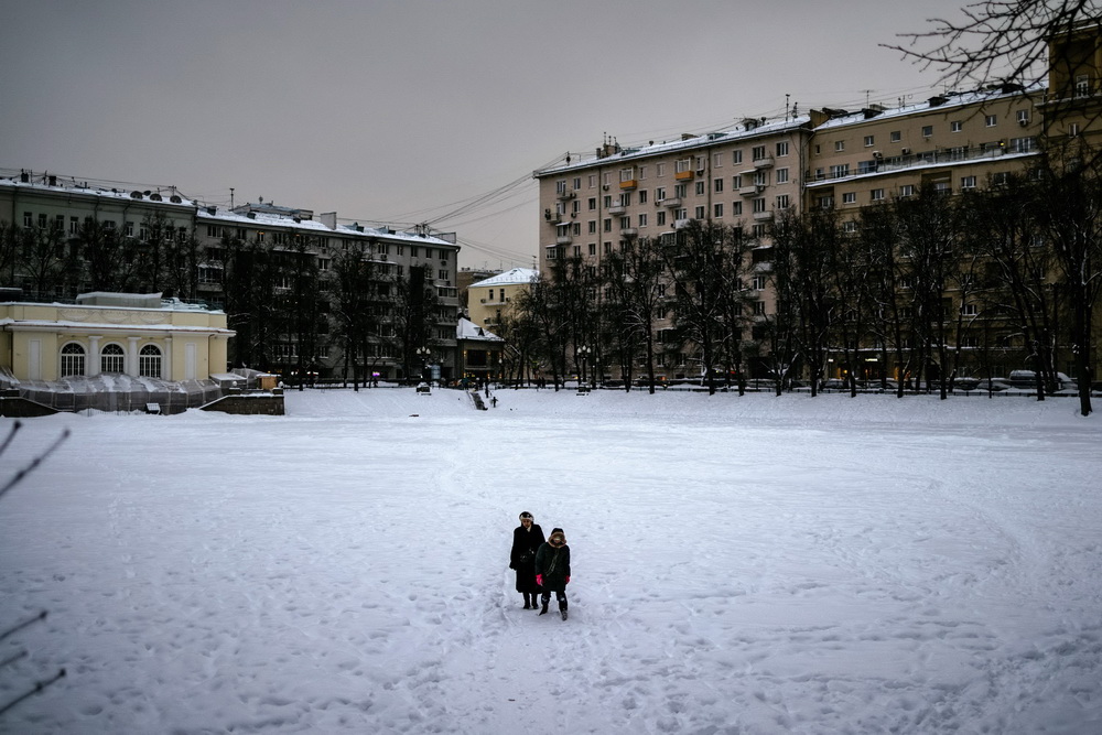 2月17日,人們走在俄羅斯莫斯科一處被積雪覆蓋的結冰池塘。新華社/法新