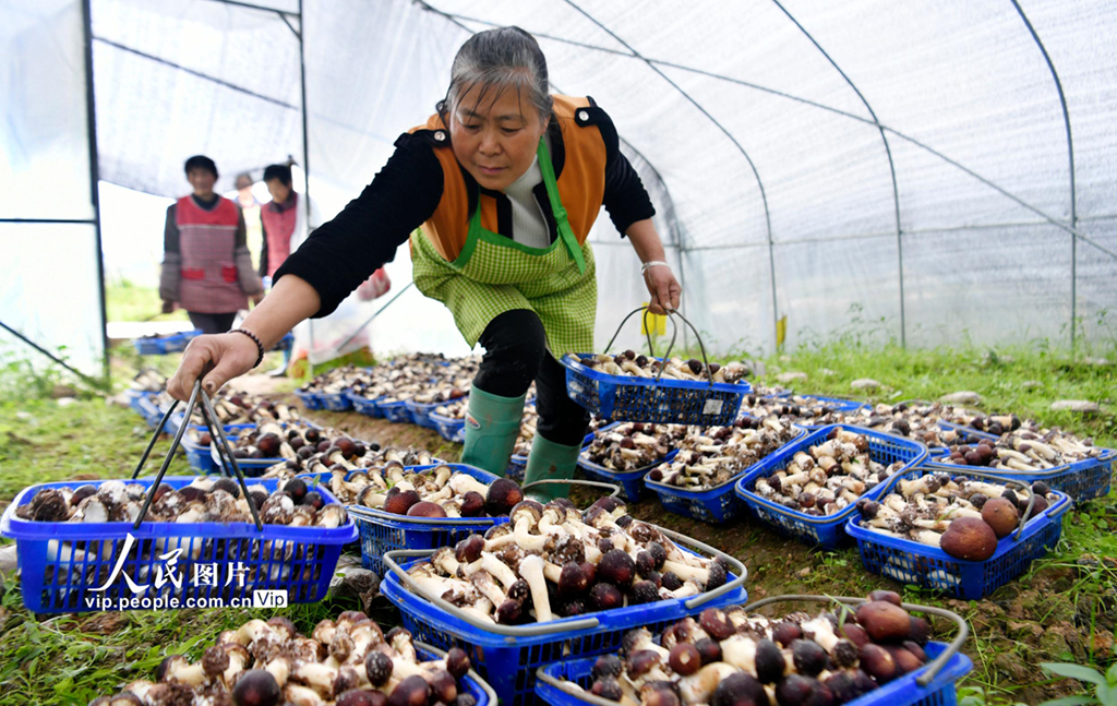 2021年4月20日,四川省廣安市岳池縣茍角鎮紅朝門村村民在采摘食用菌——球蓋菇。張啟富攝(人民圖片網)