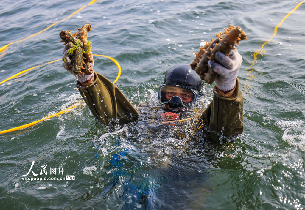 2021年4月20日,在山東省榮成市虎山鎮天海灣海參養殖海區,“海猛子”在展示捕撈的海參。李信君攝(人民圖片網)