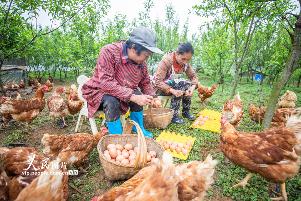 2021年4月17日,貴州省畢節市金海湖新區岔河鎮塘豐社區400余畝林下生態養雞場里一派繁忙,村民們忙著收集、清理、分裝雞蛋,供應市場需求。羅大富攝(人民圖片網)