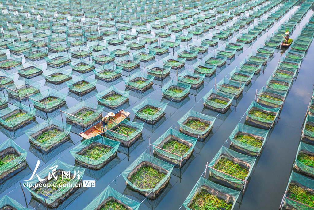 2021年4月21日,廣東省廣州市白云區江高鎮硤石村鱔魚養殖基地,清清碧水間一排排整齊有序的“綠色網箱”春意盎然,養殖戶搖著小船給用來養殖黃鱔的網箱里種植生態水草。邱新生攝(人民圖片網)