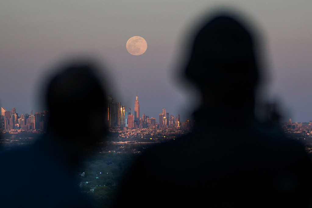 4月26日,人們在美國新澤西州西奧蘭治觀看從紐約曼哈頓上空升起的滿月。 新華社/路透