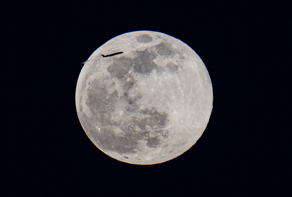 4月26日在美國紐約曼哈頓拍攝的一架飛機從滿月前飛過。新華社/法新