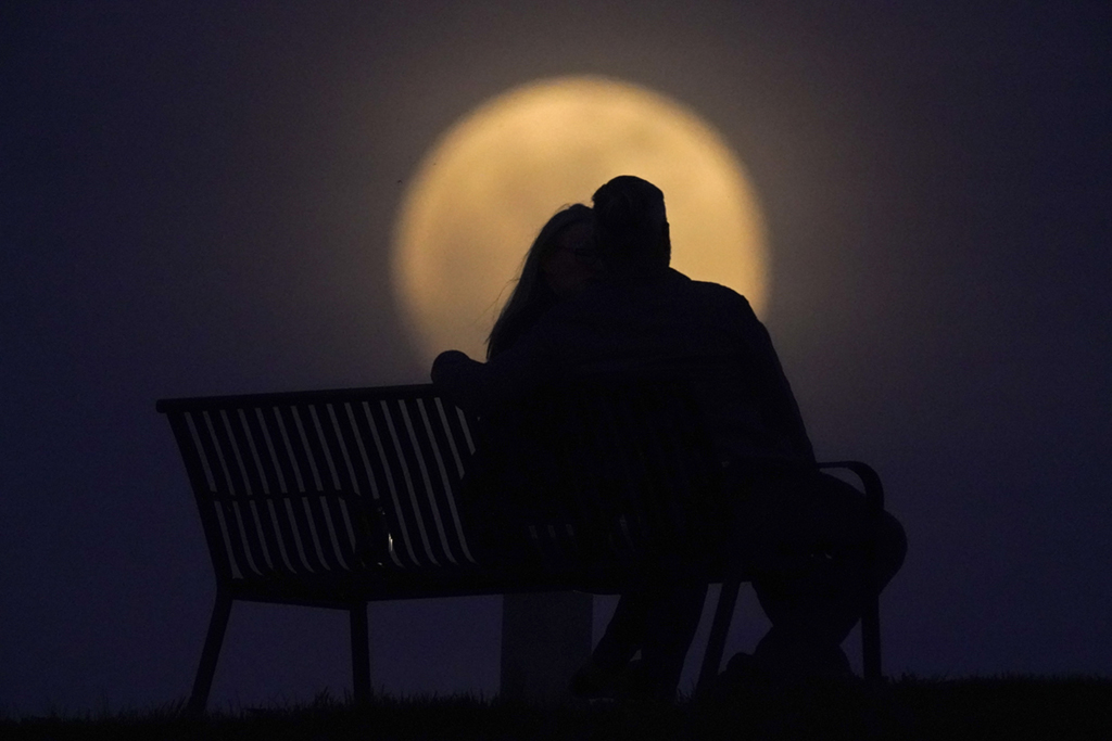 4月26日,一對情侶在美國印第安納州新奧爾巴尼市欣賞滿月。新華社/美聯