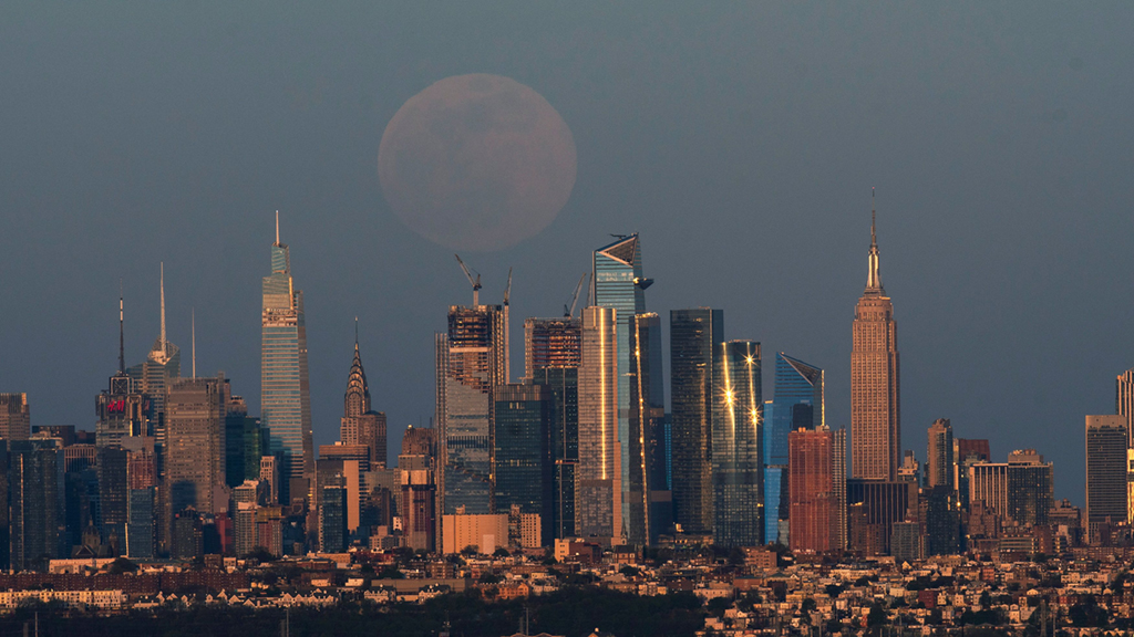 4月26日在美國新澤西州西奧蘭治拍攝的從紐約曼哈頓上空升起的滿月。新華社/路透