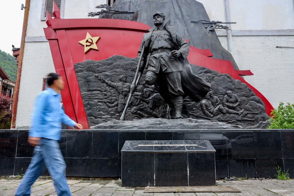 參觀者從鐘赤兵紀念廣場鐘赤兵雕像前經過(4月20日攝)。新華社記者 歐東衢 攝