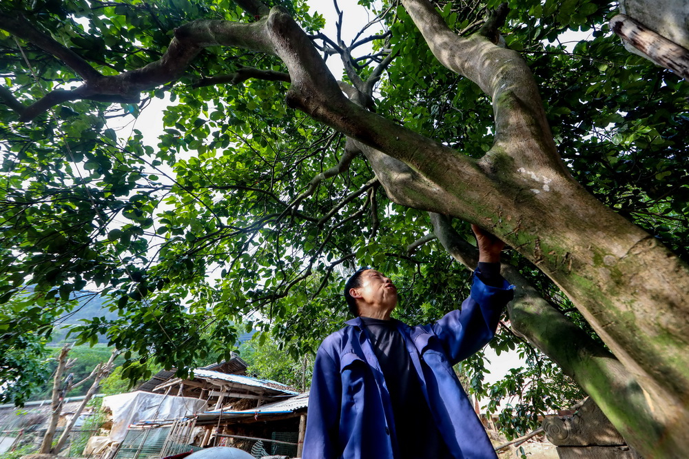 4月21日,宋加通的兒子、72歲的宋光平在查看他的父親從江西老家帶回來并親手栽下的柚子樹的生長情況。新華社記者 歐東衢 攝