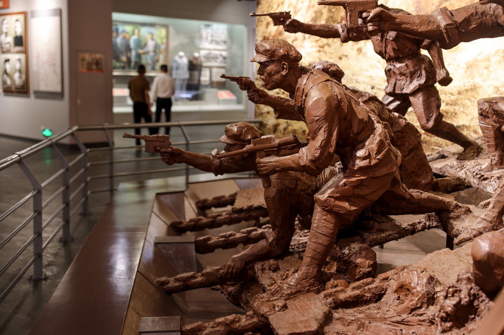 甕安縣猴場鎮,猴場會議陳列館,有一座紅軍戰士與老鄉低頭扎竹筏的雕塑。